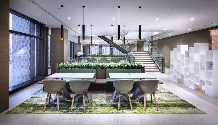 清透的玻璃和充滿生機的綠植墻打造的步行樓梯,以此鼓勵內部人員的流動。同時周邊開放的設計意在創(chuàng)建一種基于動態(tài)的工作模式(ABW),通過協(xié)作空間將人們聚集在一起。
