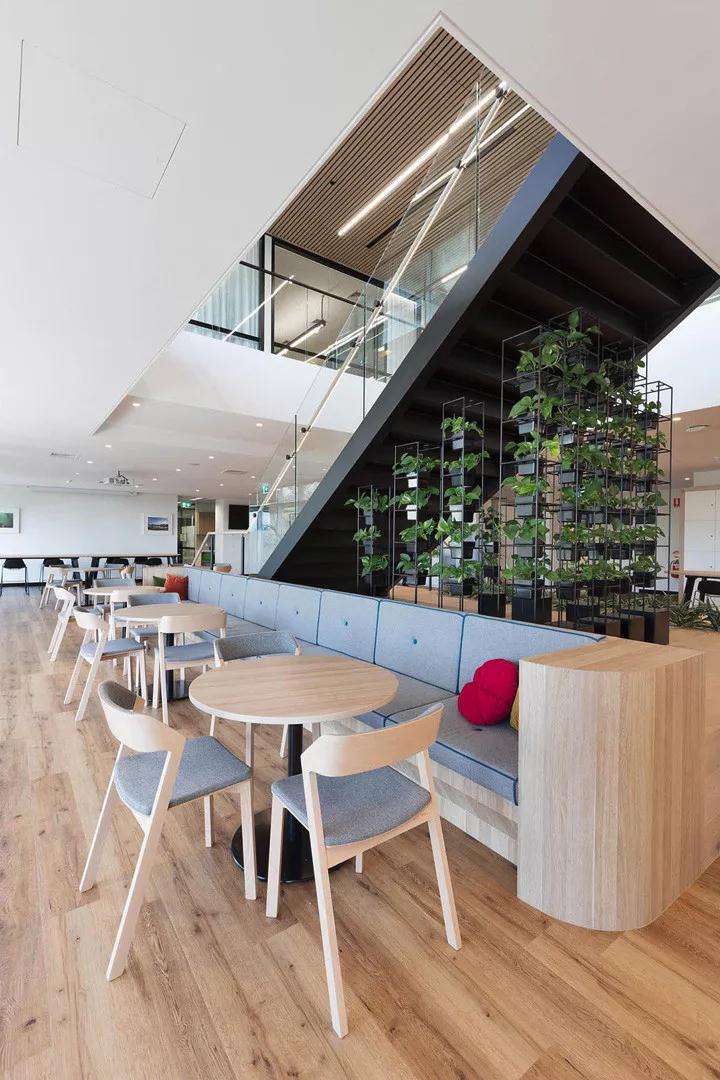 這道樓梯不僅促進(jìn)和鼓勵(lì)員工健康的行為方式和相互協(xié)作,在其下方還構(gòu)建了一處垂直花園,為空間增添了自然元素。