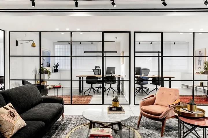 現(xiàn)代照明,復(fù)古地毯,棉布窗簾,用于墻壁裝飾的本地藝術(shù)攝影,植物,書籍和其他配件等,使該寫字樓裝修設(shè)計(jì)空間煥發(fā)出舒適的居家氛圍。