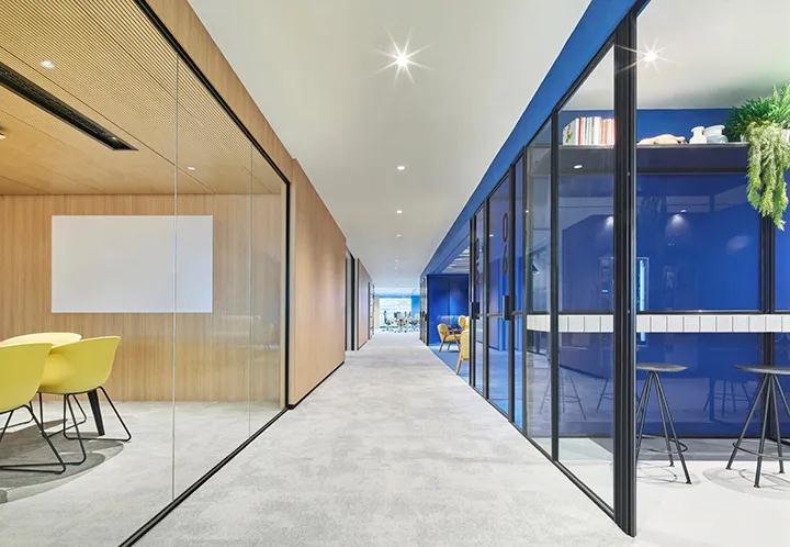 淺色人行道,淺色開放工作區和淺色木飾面均與空間的藍色空間形成鮮明對比。沒有牢固的隔斷墻,功能空間就通過色彩的創造得到清晰而有力的界定,創造出精致,簡單和高度個性化的時尚辦公環境。