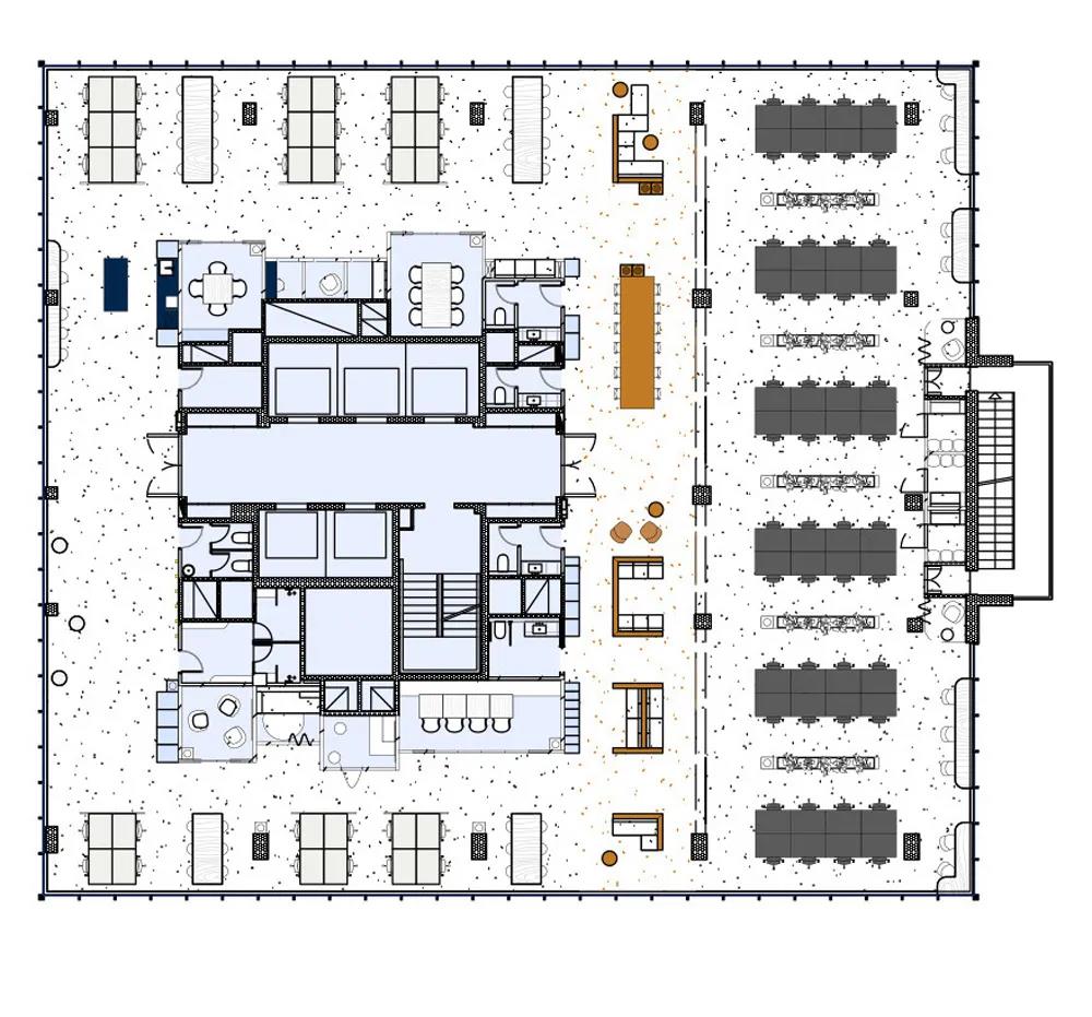 兩層樓由清新的藍色空間連接。藍色核心空間包含所有必要的輔助和協作空間,如會議室、電話亭和廚房。